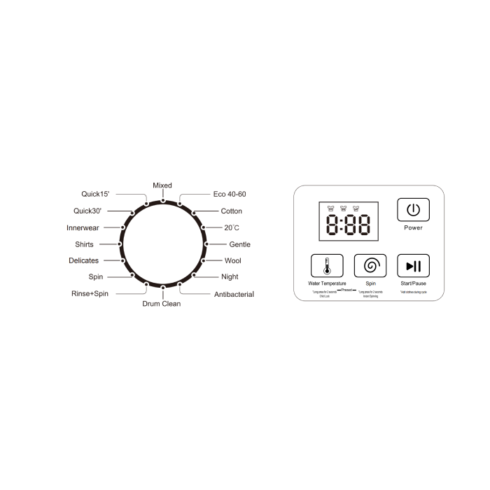 | Programs | Mixed, Eco 40°-60°, 20°, Gentle, Wool, Night, Antibacterial, Drum Clean, Rinse+Spin, Spin, Delicates, Shirts, Innerwear, Quick 30min, Quick 15 min |